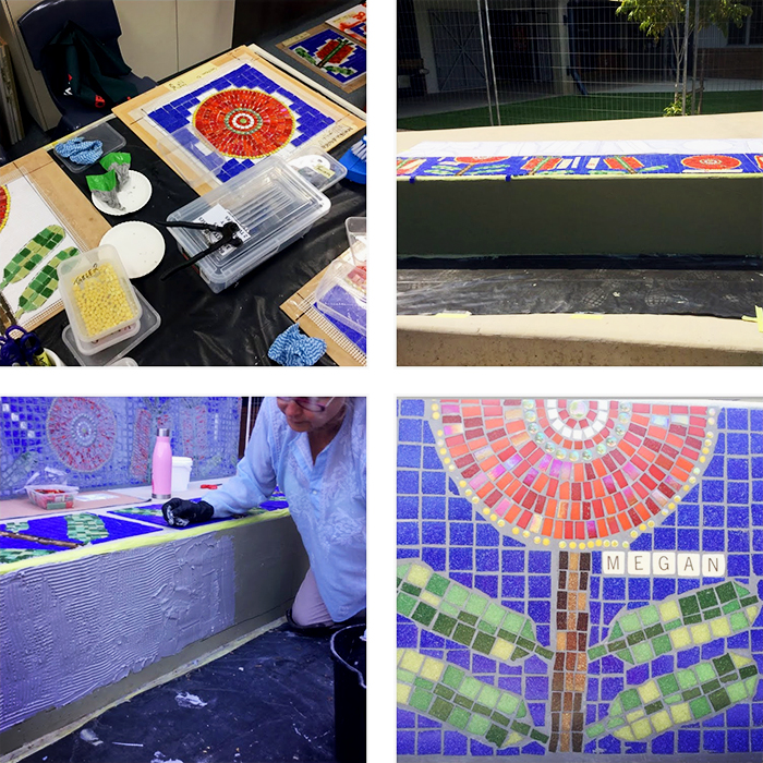 Community Mosaic Projects Using LATICRETE![]() The Callistemon Seat Mosaic Mosaic artists Lee FullARTon and Denise Chard worked on a community mosaic project at Claremont Special School in Ipswich, QLD and they shared their project with us; In mid-2019, collaborating artists Lee FullARTon and Denise Chard began planning a mosaic installation of approximately 16m² for an existing two-tiered cement seat located in the communal area of Claremont Special School in Ipswich, QLD. The installation was funded by the Queensland Government Gambling Fund. Lee and Denise worked with eight pre-vocational students and two teacher aides, once a week, over two school terms. The concept and design was drawn up in the studio and each week the students worked on the motifs, which captures the local Callistemon Tree that is featured throughout the school grounds and the local area. The students were taught how to use mosaic leponetts to cut 20mm glass tiles and adhere to fiberglass mesh panels using small amounts of 335 Premium Flexible Adhesive, following a cartoon pattern that was secured underneath the mesh.
