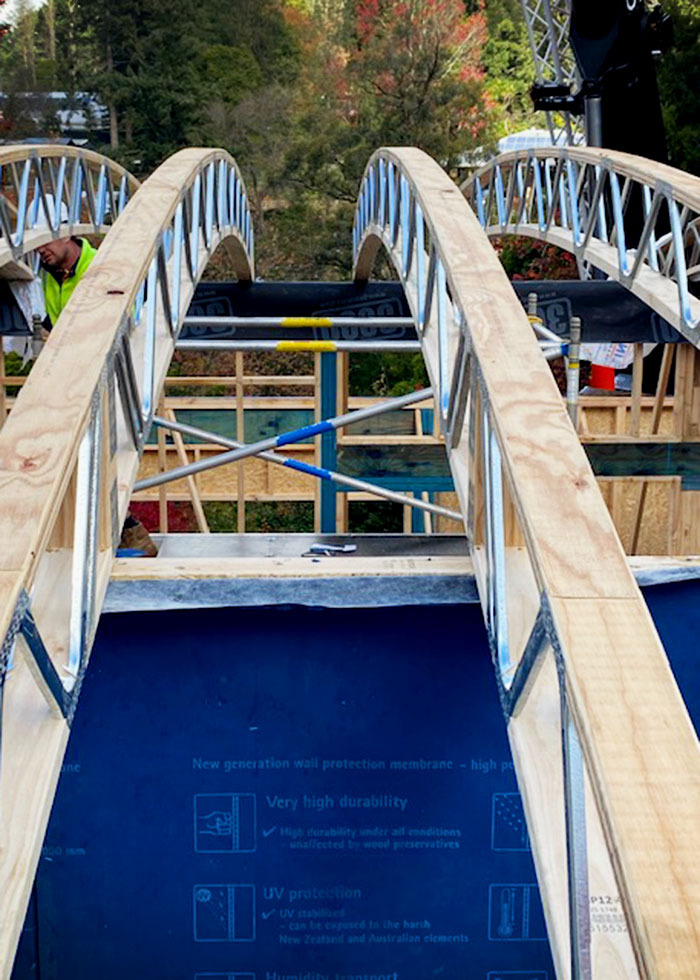 Trusses for Curved Timber Roof Prefabrication by MiTek![]() A timber prefabrication CURVE-BALL! Everyone likes to be busy, but sometimes it's those more 'interesting' jobs that make work a bit more rewarding. So, when a customer throws you a curve ball, what do you do? Hit it out of the park. And that's exactly what Brook Chambers and his team did when asked to create a timber prefabricated, curved roof. "I love a challenge - plus getting out of your comfort zone is a good thing - it keeps you on your toes," said Brook, Managing Director at FrameWayz Panelised Building, half an hour south of Adelaide's CBD. There were a few other hidden surprises in the structure too. The owners of the new home knew a 'square-by-square' pop-up home wasn't what they wanted for their family - so they employed the services of well-known and respected local Building Designer, Merrin Kosters. Merrin is also Lecturer/Course Coordinator of Building Design at Tonsley TAFE. "My students will all tell you the first thing they learn in my classes is: no boxes - no flat straight lines," she laughed. Before Merrin puts anything to paper she likes to really get to know her clients. With clients who build guitars and are devoted to their Japanese garden, Merrin knew that this design needed the 'movement' of beautiful curves. "Research is the backbone/heart of every design. Innovative construction techniques and systems, and going to the site - looking at it from every perspective. Understanding how the structure will sit within the environment - yet still make a statement," added Merrin. "This design is proof that a home can be aesthetically pleasing, functional, and above-all-else leave a responsible footprint long after construction is completed. If a client doesn't have these same aspirations... I will convince them otherwise - it is sound environmental and financial good sense." Merrin's involvement continues from day one, with design and material selections, through to construction. This can sometimes mean 'compromises' between Designer and Builder. "But we all wanted the same outcome - with the same holistic approach to the project. So, this 'passive house' needed the right team to help it come together." There are few builders who specialise in these type of niche projects. 'Passive houses' are designed to use very little externally sourced energy to heat or cool the structure. They rely on air tight construction, insulation, clever design to maximise light, and the use of natural construction materials to further reduce the building's ecological footprint. Passive house structures utilise natural materials and mechanics to create a more 'liveable' environment. "Jackson Digney, from Enduro Builders had been assisting with the specification for this home incorporating large curved ceilings and open spaces. When he said he wanted a timber solution, the challenge was on," exclaimed Brook. Jackson is a builder by trade but an innovator by passion. "Yes, we do the normal - but it's the out-of-the-ordinary where we excel," said Jackson proudly. "Passive housing is science-based, so data projections and outcomes play a big part in the way a building is designed, what materials are used, and how it is built." Jackson adds, "we can look at a design, assess its attributes and deficiencies, and, through data analysis, produce better outcomes. Make this higher, turn this that way, use solid structure not glass; can all make a huge difference." "We knew steel would never be an option for this job," stressed Jackson. "It has way too much environmental baggage - and the issues with thermal bridging cannot be ignored. Steel is expensive and irresponsible on so many levels. Timber is a renewable resource that rewards the planet with regrowth assets - and the advances in timber engineering make it an affordable solution to complex designs." Being a licensed MiTek fabricator, Brook recalled instances where PosiStrut Trusses had been used on similar jobs.