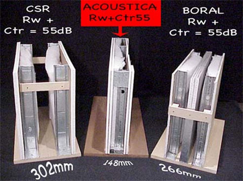 Acoustica™ has developed a new incredibly thin & soundproof (patent pending) wall system![]() The Acoustiflex® wall system has the highest acoustic performance rating for any wall under 150 mm thick providing Rw 60 or higher. Thickness is a very important consideration as the floor space in a typical apartment is $6000 per square metre. The Acoustiflex® Wall System, however, is only 148 mm wide & has an acoustic performance that can be matched only by wall systems a great deal thicker (250-300 mm). Acoustiflex® is a specially engineered product designed for use in noise insulation. It consists of a flexible 'calcium carbonate' loaded polymeric elastomer, supported by a polyester film with reinforced aluminum foil on one side & a non-woven polyester fabric on the other. Acoustiflex® offers high mass to stiffness ratio & because of its limpness has excellent low & high frequency sound attenuation. Acoustiflex® is fire-rated & tested by C.S.I.R.O. It is strong, tear resistant, flexible & economic. Acoustiflex® increases low frequency performance by damping of the plasterboard panel. Acoustiflex® is also used to control the large coincidence dip in the upper-mid frequency region of 2500-4000 Hz which typically occurs in plasterboard walls. As demonstrated by extensive testing, there is drastic improvement in the nominated frequency regions when the F2.5 Acoustiflex® is added between two sheets of 13 mm normal density plasterboard. The performance gain at the coincidence dip frequency is 9 dB, for the application of the f2.5 Acoustiflex®, with significant gains occurring above this frequency. The Acoustiflex® Wall System is the ONLY system of its kind to achieve this very high result for such a thin wall. Acoustiflex® Wall System has been examined under the "Acoustic Performance Index" & its rating is extremely high. 'Acoustic Performance Index' takes into account the cost of the wall compared to its acoustic performance, the thickness of the wall & the floor-space cost. ACOUSTICA™ COMPARED WITH CSR & BORAL WALL SYSTEMS: ![]()